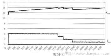 圖9為整個充電歷程的充電電流與電池端電壓變化曲線圖,由圖中得知曲線前段呈現(xiàn)持續(xù)上升,而當(dāng)電壓達(dá)到14V時,充電器控制進(jìn)入多階段充電模式,并改以改變電池端充電電流對電池充電,如圖9的后段曲線所示,整體充電時間為4,283秒。