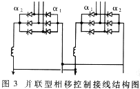 采用并聯(lián)型相移控制,就是在半橋間交*其觸發(fā)角α1和α2(α1≠α2),接線圖如圖3所示。由于給這兩組整流橋供電的兩個(gè)帶中性點(diǎn)星形連接的次級(jí)繞組位于整流變壓器的同一鐵芯上。這樣,由相移控制在整流變壓器兩個(gè)次級(jí)繞組中所產(chǎn)生的偶次諧波和直流分量在整流變壓器的原邊被完全抵消。并聯(lián)型相移控制情況下,直流輸出電壓是a1、a2的函數(shù),參數(shù)的這種視在多余度不但可以控制直流輸出電壓,而且還可以控制無(wú)功功率。但在單并聯(lián)型相移控制情況下,不