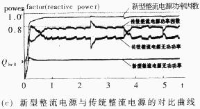 新型整流電源系統(tǒng)設(shè)定電壓值VS=700V、電流值IS=100KA和給定無(wú)功功率Qhvo=28MVA,控制系統(tǒng)采用模糊—PI控制器。新型整流電源系統(tǒng)輸出的電流、電壓、無(wú)功功率以及功率因數(shù)的仿真結(jié)果曲線如圖10(a)(b)所示,新型整流電源與傳統(tǒng)三相全控整流橋運(yùn)行的對(duì)比曲線如圖10(c)所示。