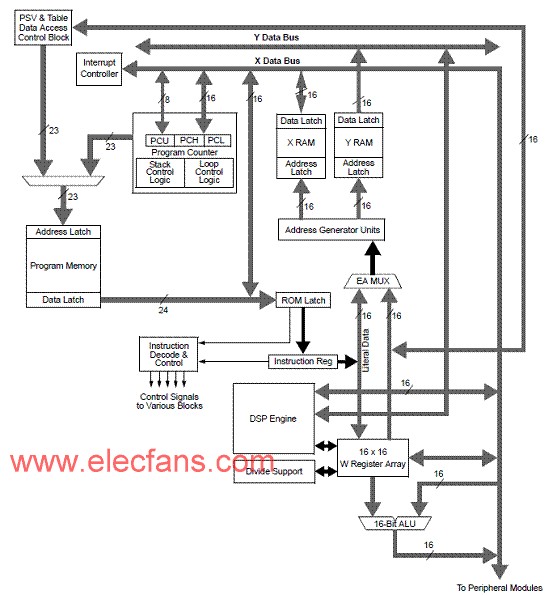 圖2。dsPIC33FJ06GS101/X02和dsPIC33FJ16GSX02/X04 CPU 核方框圖