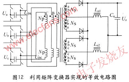 三個單相PFC經逆變后的交變電壓相位、頻率、幅值相同,通過三相矩陣高頻變壓器的耦合、變壓及隔離,輸出所需要的直流電壓。三個單相PFC獨立性比較強,輸出之間相互電氣隔離,解決了三個單相PFC之間相互影響的圖12利用矩陣變換器實現(xiàn)的等效電路圖這一技術難題。