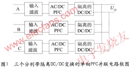 1)由三個分別帶隔離DC/DC變換的單相PFC并聯(lián)組成的方法