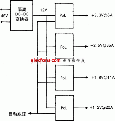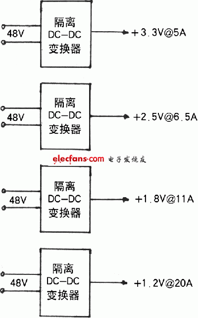 傳統(tǒng)的分布式電源架構(gòu)采用多個隔離型DC-DC電源模塊將48V總線電壓轉(zhuǎn)換到系統(tǒng)電源