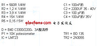 該可調(diào)穩(wěn)壓電源電路采用了眾所周知的穩(wěn)壓IC LM723。 IC LM 723設(shè)計用于提供2-37伏的電源電壓和150mA的電流,這個電流確實很小,但是借助外部晶體管可以實現(xiàn)高達10A的電流,并且在此電路中可以提供電壓為 3-30V,并在 TR2 的幫助下將電流限制為 2.5 A。