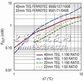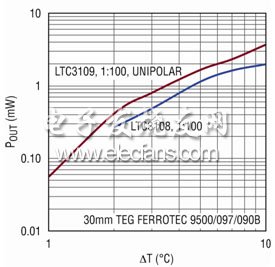 圖 10 示出了一個(gè)邊長(zhǎng) 30mm 的方形 TEG 在 1oC 至 20oC 的 ΔT 范圍內(nèi)輸出電壓及最大輸出功率能力。在該 ΔT 范圍內(nèi),輸出功率從幾百 μW 到幾十 mW 不等。需要指出的是:該功率曲線是在假設(shè)擁有理想的負(fù)載匹配且無(wú)轉(zhuǎn)換損耗的情況下得出的。最后,在利用 LTC3108 提升至一個(gè)較高電壓之后可獲得的輸出功率將由于功率轉(zhuǎn)換損耗的原因而低于圖中示出的數(shù)值。LTC3108 的產(chǎn)品手冊(cè)中給出了幾幅在多種不同工作條件下可提供輸出功率的曲線圖。