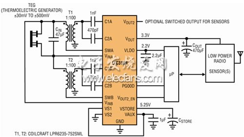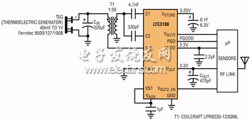 采用 3mm x 4mm x 0.75mm 12 引腳 DFN 封裝或 16 引腳 SSOP 封裝的LTC3108 解決了超低輸入電壓應(yīng)用的能量收集問(wèn)題。該器件提供了一款緊湊、簡(jiǎn)單和高度集成的單片式電源管理解決方案,能在輸入電壓低至 20mV 的情況下正常運(yùn)作。憑借這種獨(dú)特的能力,LTC3108 可利用一個(gè)熱電發(fā)生器 (TEG) 來(lái)為無(wú)線傳感器供電,并從小至 1oC 的溫度差 (ΔT) 收集能量。采用一個(gè)現(xiàn)成有售的小型 (6mm x 6mm) 升壓變壓器和少量的低成本電容器,該器件即可提供用于給當(dāng)今的無(wú)線傳感器電子線路供電所需的穩(wěn)定輸出電壓。