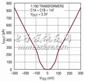 LTC3109 是唯一適合克服這種從任一極性的能量源收集能量之挑戰(zhàn)的器件。LTC3109 運(yùn)用具 1:100 升壓比的變壓器,能以低至 ±30mV 的輸入電壓工作。LTC3109 與 LTC3108 的功能相同,包括一個(gè) LDO、一個(gè)數(shù)字可編程的輸出電壓、一個(gè)電源良好輸出、一個(gè)開(kāi)關(guān)輸出和一個(gè)能量存儲(chǔ)輸出。LTC3109 采用 4mm x 4mm 20 引腳 QFN 封裝或 20 引腳 SSOP 封裝。圖 15 顯示了 LTC3109 在自動(dòng)極性應(yīng)用中的一個(gè)典型例子。如圖 16 所示,該轉(zhuǎn)換器的輸出電流隨 VIN 變化的曲線說(shuō)明,該器件在任一極性的輸入電壓時(shí),都能同樣良好地工作。