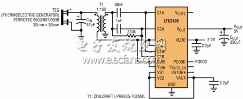 需要注意:在單極性配置中,LTC3109 對(duì) TEG 呈現(xiàn)出約 1Ω 的負(fù)載電阻,因此應(yīng)選擇一個(gè)具有非常低源電阻的 TEG 以實(shí)現(xiàn)優(yōu)良的負(fù)載匹配,否則在單極性配置中使用 LTC3109 將毫無(wú)優(yōu)勢(shì)可言,這一點(diǎn)很重要。本例中所采用的 TEG 具有 1.0Ω 的標(biāo)稱源電阻,旨在實(shí)現(xiàn)最佳的功率傳輸。
