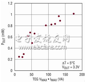 圖 9:LTC3108 輸出功率與具有不同 V 和 I 乘積的 TEG 關(guān)系曲線