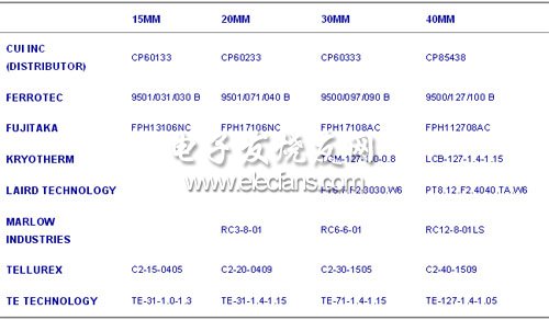 就給定應(yīng)用而言,所需要的 TEG 尺寸取決于可用的最小 ΔT、負(fù)載所需的最大平均功率、以及用于將 TEG 的一端保持于環(huán)境溫度的散熱器的熱阻。LTC3108 的最大功率輸出位于 15μW/K-cm2 至 30μW/K-cm2 之間,具體數(shù)值取決于所選擇的變壓器匝數(shù)比和特定的 TEG。表1 羅列了一些推薦使用的 TEG 器件型號(hào)。