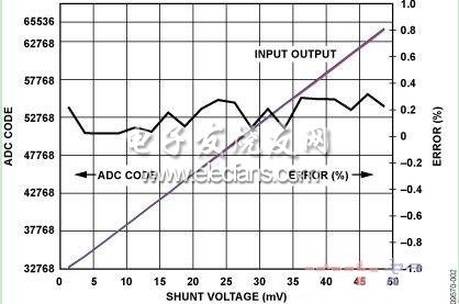 圖2中的曲線圖顯示,受測試的電路在整個(gè)輸入電壓范圍(0 mV至50 mV)實(shí)現(xiàn)了0.3%的誤差。另外還比較了LabVIEW記錄的ADC輸出代碼與基于理想系統(tǒng)而計(jì)算的理想代碼。