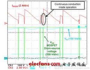 出現(xiàn)一些人耳可聽到的噪聲。能夠使用一顆簡(jiǎn)單的電阻來改善這功能。其次,在啟動(dòng)序列期間,PFC段也可能呈現(xiàn)出過大的過沖??梢栽诜答伕袦y(cè)網(wǎng)絡(luò)中放置一顆電容來限制或抑制這過應(yīng)力。即便是在電源設(shè)計(jì)的極晚階段,這兩種調(diào)整方法都易于實(shí)施。