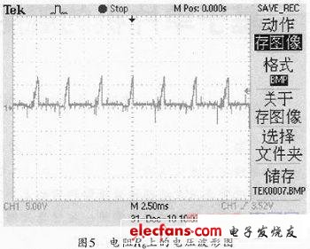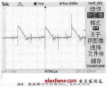 (3)在送出的KZi信號(hào)為低,延時(shí)約10ms后(目的:充分保障觸發(fā)電路準(zhǔn)備好),允許功率回路C3帶負(fù)載。此時(shí),如果C3電容兩端電壓比整流出的電壓(即圖2中的0端對(duì)2腳端的電壓)高,則整流橋內(nèi)置的可控硅仍不導(dǎo)通,只有在下一個(gè)充電周期:當(dāng)0端的電壓比1端的電壓高、且采樣電阻R6上的電壓降足以讓整流橋內(nèi)置的可控硅導(dǎo)通時(shí),可控硅才會(huì)導(dǎo)通。由圖2功率回路帶電機(jī)負(fù)載(負(fù)載功率約為5KW)后測(cè)得的可控硅控制極(6、7端)實(shí)際波形如圖3、圖4所示。