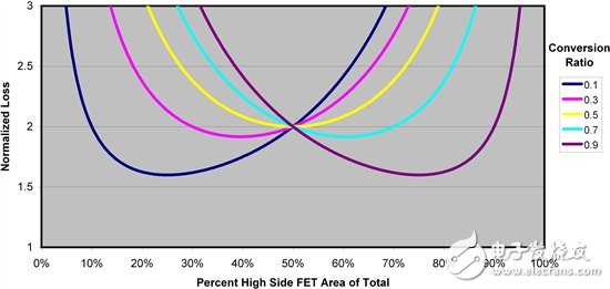 降壓功率級(jí)中如何對(duì)傳導(dǎo)功耗進(jìn)行折中處理,而其與占空比和 FET 電阻比有關(guān)。進(jìn)行這種折中處理可得到一個(gè)用于 FET 選擇的非常有用的起始點(diǎn)。通常,作為設(shè)計(jì)過程的一個(gè)組成部分,您會(huì)有一套包括了輸入電壓范圍
