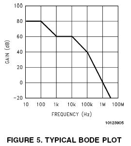 假設直流增益(DC gain)為80dB,第一個極點(pole)發(fā)生在100Hz處。在此頻率,增益曲線的斜度變?yōu)椋?0dB/十倍頻程。1kHz處的零點使斜度變?yōu)?dB/十倍頻程,到10kHz處斜度又變成-20dB/十倍頻程。在100kHz處的第三個也是最后一個極點將斜度最終變?yōu)椋?0dB/十倍頻程。