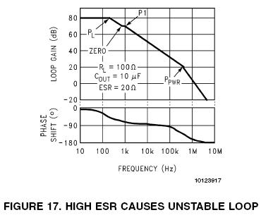 選擇具有很低的ESR的輸出電容,由于一些不同的原因也會產(chǎn)生振蕩。繼續(xù)沿用上一節(jié)的例子,假定10uF輸出電容的ESR只有50mΩ,則零點的頻率會變到320kHz(圖18:低ESR引起回路振蕩的波特圖)。
