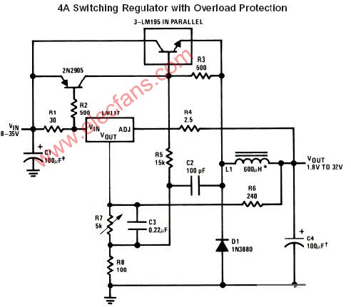 31 3V-30V/3A可調(diào)穩(wěn)壓電源電路圖。這是一種可調(diào)穩(wěn)壓電源,直流電壓穩(wěn)定在3V到30V之間,前提是消耗不超過3A直流電。該電路具有短路保護(hù)和過載保護(hù)功能。