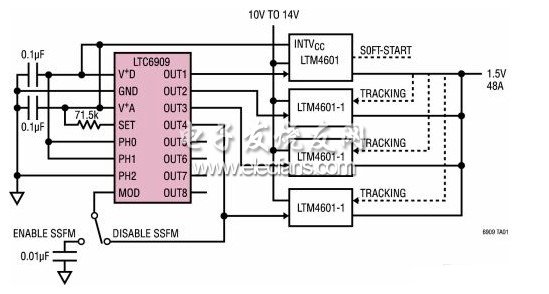 49 一種利用微型模塊(μModule) DC/DC開關(guān)穩(wěn)壓器(即完整的DC/DC開關(guān)穩(wěn)壓器系統(tǒng)級封裝)的新技術(shù)可實(shí)現(xiàn)具低EMI、低輸出及輸入紋波電流的大電流模塊化負(fù)載點(diǎn)穩(wěn)壓器。