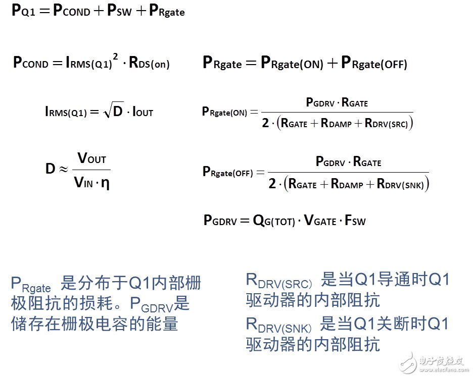 對(duì)于高頻應(yīng)用(>MHz),控制管Q1的選用應(yīng)針對(duì)降低開關(guān)損耗進(jìn)行優(yōu)化。Q1損耗的計(jì)算公式如下: