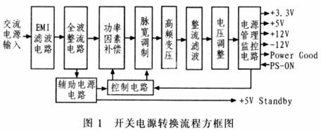 圖l為開關(guān)電源轉(zhuǎn)換流程方框圖,開關(guān)電源轉(zhuǎn)換流程為交流輸入→EMI濾波電路→整流電路→功率因子修正電路→功率級一次側(cè)(高壓側(cè))開關(guān)電路轉(zhuǎn)換成脈流→主要變壓器→功率級二次側(cè)(低壓側(cè))整流電路→電壓調(diào)整電路(DC-DC轉(zhuǎn)換電路)→濾波電路→電源管理監(jiān)控→輸出。