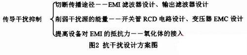 計主要從減小干擾源的EMI能量;切斷干擾傳播途徑;提高受擾設(shè)備的抗干擾能力等方面入手提高設(shè)備抗干擾能力,采用措施如圖2所示。