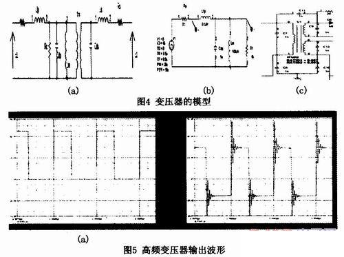 對(duì)圖4(b)電路進(jìn)行仿真得圖5波形,變壓器輸入波形和輸出波形分別如圖5(a)、(b)所示??梢?jiàn),由于分布參數(shù)的存在,在上升沿和下降沿具有上下沖尖峰存在,這是互感和漏感在開(kāi)關(guān)轉(zhuǎn)換瞬時(shí)引起電壓尖峰,是EMI的主要來(lái)源,必須加以控制。為此,改進(jìn)電路如圖4(c)所示,