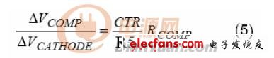 VCATHODE是AS431的陰極電壓,也就是誤差補(bǔ)償放大器的輸出電壓。CTR是光耦的電流傳輸比。R5(原文為R6,譯注)是與光耦的二極管串聯(lián)的限流電阻。RCOMP是AS3842的COMP腳當(dāng)其試圖拉電流超過它的最大輸出電流時(shí)的輸出阻抗。