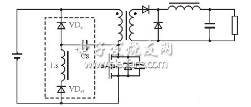 LC吸收電路如圖3所示, 它由Ls、Cs、VDs1和VDs2構成。若開關斷開, 蓄積在漏磁或勵磁等電感中的能量可通過VDs1經電容Cs放電, 使吸收電容Cs電壓反向, 從而使變壓器由電容電壓消磁。這期間, 輸入電壓與吸收電容的電壓加到開關上的電壓極性再次反向。一般情況下, LC吸收電路不消耗能量。