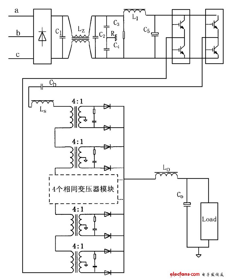 鑒于如此大功率的輸出,高頻逆變部分采用以IGBT為功率開關(guān)器件的全橋拓撲結(jié)構(gòu),整個主電路如圖1 所示,包括:工頻三相交流電輸入、二極管整流橋、EMI 濾波器、濾波電感電容、高頻全橋逆變器、高頻變壓器、輸出整流環(huán)節(jié)、輸出LC 濾波器等。
