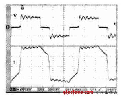 為了消除諧振及減小功率母排、濾波電容的溫升,我們最終采用了容性功率母排,圖4 為采用容性功率母排后滿功率時采集的變壓器初級的電壓、電流波形圖。從圖中可以看出,諧振基本消除,滿載運行一小時后,無感功率母排的溫升為11 ℃,電容C5的溫升為10 ℃。