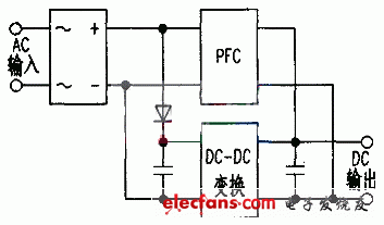 傳統(tǒng)的開(kāi)關(guān)電源結(jié)構(gòu)如下圖,是將功率因數(shù)校正電路(PFC,PowerFactorCorrection)和DC-DC變換電路串聯(lián)起來(lái)。因而效率低,要減少待機(jī)功率也相當(dāng)困難。