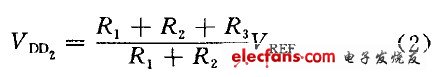 時(shí),比較器跳轉(zhuǎn),N1開(kāi)通,UVLO-out開(kāi)始變l.通過(guò)合理設(shè)置R1、R2、R3值就可以使VDD1=9.5 V,VDD2=7V,即VDD上升到9.5 V時(shí)UVLO輸出為零,芯片正常工作; VDD下降到7 V 時(shí)芯片停止工作。