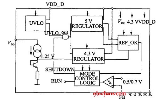 整個(gè)系統(tǒng)的構(gòu)成如圖1所示。系統(tǒng)中包括一個(gè)欠壓鎖定電路(UVLO,Under voltage lockout),用于保證電路在合適的電壓范圍內(nèi)正常工作;一個(gè)帶隙基準(zhǔn)電壓源和一個(gè)專(zhuān)為數(shù)字模塊供電的電壓源(記為VDD_D),分別為芯片提供基準(zhǔn)偏置和數(shù)字部分的電源。具體構(gòu)成時(shí)此兩模塊包含在UVLO模塊內(nèi)。兩個(gè)電壓調(diào)整器(REGULATOR)分別產(chǎn)生一個(gè)5 V和一個(gè)4.3 V 的穩(wěn)定電壓,其中5 V穩(wěn)定電壓源輸出記為REG,用于在重載時(shí)為控制器供電(輕載時(shí)關(guān)斷);4.3 V 穩(wěn)定電壓源輸出記為VDD_AD,用于輕載時(shí)的供電。當(dāng)然,必要時(shí)還可以利用帶隙基準(zhǔn)產(chǎn)生更多不同的電壓以滿足復(fù)雜控制模式的需要。