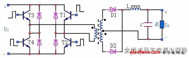 圖中T1、T4為一對,由同一組信號驅(qū)動,同時導通/關(guān)端;T2、T3為另一對,由另一組信號驅(qū)動,同時導通/關(guān)端。兩對開關(guān)管輪流通/斷,在變壓器原邊線圈中形成正/負交變的脈沖電流。