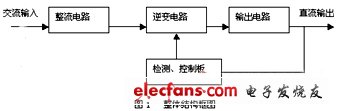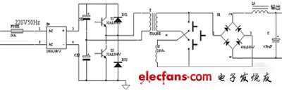 如圖所示,電網(wǎng)220V交流電輸入以后,經(jīng)過(guò)整流橋全橋整流,然后經(jīng)過(guò)濾波電容濾波后供給半橋式的逆變電路進(jìn)行逆變,得到高頻的交流脈沖電壓,然后經(jīng)過(guò)高頻變壓器輸出(通過(guò)變壓器抽頭變化,實(shí)現(xiàn)兩檔輸出),再經(jīng)過(guò)橋式整流電路整流、LC濾波電路濾波,最后輸出到負(fù)載。
