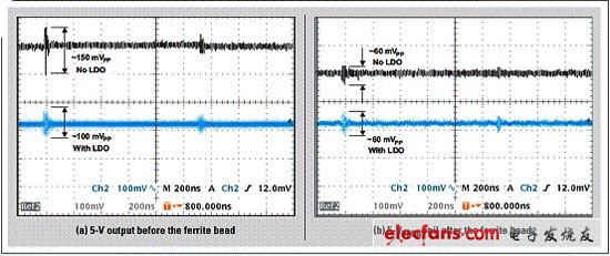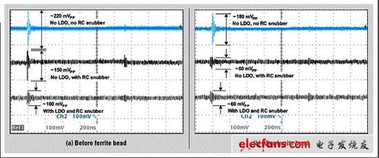 圖3:實(shí)驗(yàn)2(使用LDO)和實(shí)驗(yàn)3(無(wú)LDO)的示波器截圖對(duì)比。