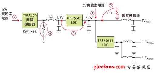 圖 2:使用ADS5483EVM的5次實(shí)驗(yàn)電源結(jié)構(gòu)。