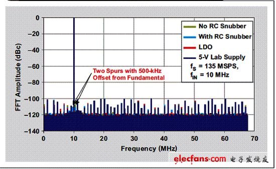 5個實驗的FFT曲線圖對比(請參見圖6)顯示雜訊底限或突波振幅沒有出現(xiàn)較大的增加。使用LDO清除開關雜訊使得輸出頻譜看起來幾乎與乾凈5V實驗室電源完全一樣。去除LDO以后,我們觀測到從交換式穩(wěn)壓器產生了兩個突波,其具有一個來自10MHz輸入音調的約500kHz頻率偏置。RC緩衝器電路降低這些突波振幅約3dB,從約-108dBc降到了約-111dBc。這一值低于ADS5483的平均突波振幅,其顯示ADS5483可在不犧牲SNR或SFDR性能的情況下直接由一個交換式穩(wěn)壓器來驅動。