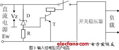 直流開關(guān)電源中開關(guān)穩(wěn)壓器的過電壓保護(hù)包括輸入過電壓保護(hù)和輸出過電壓保護(hù)。如果開關(guān)穩(wěn)壓器所使用的未穩(wěn)壓直流電源(諸如蓄電池和整流器)的電壓如果過高,將導(dǎo)致開關(guān)穩(wěn)壓器不能正常工作,甚至損壞內(nèi)部器件,因此開關(guān)電源中有必要使用輸入過電壓保護(hù)電路。圖3為用晶體管和繼電器所組成的保護(hù)電路,在該電路中,當(dāng)輸入直流電源的電壓高于穩(wěn)壓二極管的擊穿電壓值時,穩(wěn)壓管擊穿,有電流流過電阻R,使晶體管T導(dǎo)通,繼電器動作,常閉接點斷開,切斷輸入。輸入電源的極性保護(hù)電路可以跟輸入過電壓保護(hù)結(jié)合在一起,構(gòu)成極性保護(hù)鑒別與過電壓保護(hù)電路。