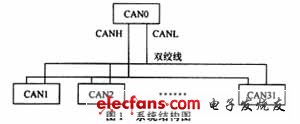 CAN總線是一種能有效支持分布式控制系統(tǒng)的串行通信網(wǎng)絡(luò),一方面,其通信方式靈活,可實現(xiàn)多主方式工作,還可實現(xiàn)點對點、點對多點等多種數(shù)據(jù)收發(fā)方式;另一方面,他能在相對較大的距離間進行較高位速率的數(shù)據(jù)通信,例如在3.3 km的距離內(nèi)其傳輸速率可達20 kb/s。我們的系統(tǒng)是由上位機對多臺并列的單電源控制系統(tǒng)進行控制管理,單電源的間距在100 m左右,且其必須置于較高的位置,系統(tǒng)之間要進行快速的數(shù)據(jù)傳輸,CAN總線能很好的滿足該系統(tǒng)的要求。