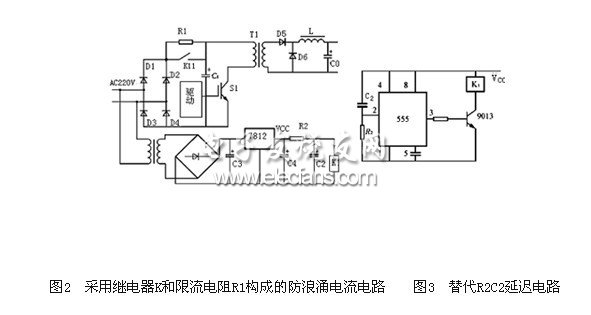 圖2是采用繼電器K和限流電阻R1構(gòu)成的防浪涌電流電路。電源接通瞬間,輸入電壓經(jīng)整流(D1~D4)和限流電阻R1對濾波電容器C1充電,防止接通瞬間的浪涌電流,同時輔助電源Vcc經(jīng)電阻R2對并接于繼電器K線包的電容器C2充電,當C2上的電壓達到繼電器K的動作電壓時,K動作,其觸點K1.1閉合而旁路限流電阻R1,電源進入正常運行狀態(tài)。限流的延遲時間取決于時間常數(shù)(R2C2),通常選取為0.3~0.5s。為了提高延遲時間的準確性及防止繼電器動作抖動振蕩,延遲電路可采用圖3所示電路替代R2C2延遲電路。
