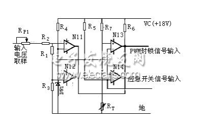 圖4是僅用一個4比較器LM339及幾個分立元器件構(gòu)成的過壓、欠壓、過熱保護電路。取樣電壓可以直接從輔助控制電源整流濾波后取得,它反映輸入電源電壓的變化,比較器共用一個基準電壓,N1.1為欠壓比較器,N1.2為過壓比較器,調(diào)整R1可以調(diào)節(jié)過、欠壓的動作閾值。N1.3為過熱比較器,RT為負溫度系數(shù)的熱敏電阻,它與R7構(gòu)成分壓器,緊貼于功率開關(guān)器件IGBT的表面,溫度升高時,RT阻值下降,適當選取R7的阻值,使N1.3在設(shè)定的溫度閾值動作。N1.4用于外部故障應(yīng)急關(guān)機,當其正向端輸入低電平時,比較器輸出低電平封鎖PWM驅(qū)動信號。由于4個比較器的輸出端是并聯(lián)的,無論是過壓、欠壓、過熱任何一種故障發(fā)生,比較器輸出低電平,封鎖驅(qū)動信號使電源停止工作,實現(xiàn)保護。如將電路稍加變動,亦可使比較器輸出高電平封鎖驅(qū)動信號。
