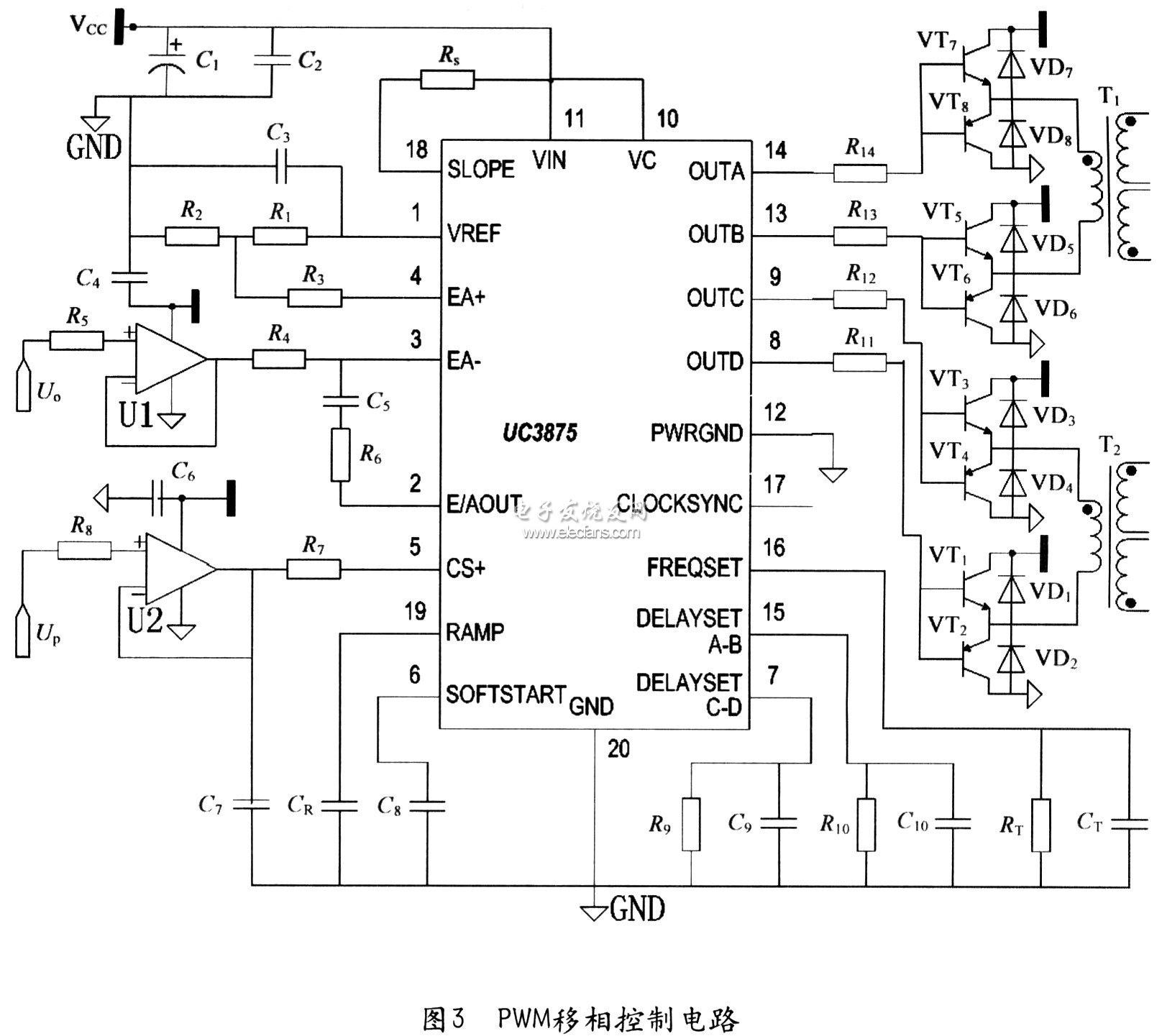 為了實現(xiàn)主回路開關(guān)管ZVZCS軟開關(guān),采用UC3875為其設(shè)計了PWM移相控制電路,如圖3所示??紤]到所選MOSFET功率比較大對芯片的四個輸出驅(qū)動信號進(jìn)行了功率放大,再經(jīng)高頻脈沖變壓器T1、T2隔離最后經(jīng)過驅(qū)動電路驅(qū)動MOSFET開關(guān)管。整個控制系統(tǒng)所有供電均用同一個15V直流電源,實驗中設(shè)置開關(guān)頻率為70kHz,死區(qū)時間設(shè)置為1.5μs,采用簡單的電壓控制模式,電源輸出直流電壓通過采樣電路、光電隔離電路后形成控制信號,輸入到UC3875誤差放大器的EA一,控制UC3875誤差放大器的輸出,從而控制芯片四個輸出之間的移相角大小,使電源能夠穩(wěn)定工作,圖中R6、C5接在EA一和E/AOUT之間構(gòu)成PI控制。在本設(shè)計中把CS+端用作故障保護(hù)電路,當(dāng)發(fā)生輸出過壓、輸出過流、高頻變原邊過流、開關(guān)管過熱等故障時,通過一定的轉(zhuǎn)換電路,把故障信號轉(zhuǎn)換為高于2.5V的電壓接到CS+端,使UC3875四個輸出驅(qū)動信號全為低電平,對電路實現(xiàn)保護(hù)。