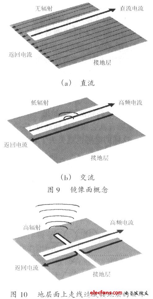 圖9(a)是當(dāng)直流電流在一個(gè)接地層上方流過(guò)時(shí)的情景。此時(shí)在地層上的返回直流電流非常均勻地分布在整個(gè)地層面上。圖9(h)顯示當(dāng)高頻電流在同一個(gè)地層上方流過(guò)時(shí)的情景。此時(shí)在地層上的返回交流電流只能流在地層面的中間而地層面的兩邊則完全沒(méi)有電流。 一日.理解了鏡像面概念,我們很容易看到在圖10中地層面上走線的問(wèn)題。接地層(Ground Plane),沒(méi)汁人員應(yīng)該盡量避免在地層上放置任何功率或信號(hào)走線。一旦地層上的走線破壞了整個(gè)高頻環(huán)路,該電路會(huì)產(chǎn)牛很強(qiáng)的電磁波輻射而破壞周邊電子器件的正常工作。