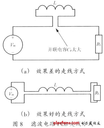 圖8顯示了在一個(gè)PCB上Vin通過(guò)L至負(fù)載(RL)的不同走線方式。為了降低電感的Cp,電感的二個(gè)引腳應(yīng)盡量遠(yuǎn)離。而Vin正極至RL和Vin負(fù)極至RL的走線應(yīng)盡量靠近。