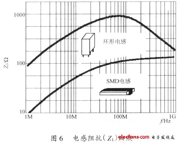 電感通常存在等效并聯(lián)電阻(EPR)和等效并聯(lián)電容(Cp)二個(gè)寄生參數(shù)。圖6是電感在不同工作頻率下的阻抗(ZL)。