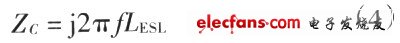 電容通常存在等效串聯(lián)電阻(ESR)和等效串聯(lián)電感(ESL)二個(gè)寄生參數(shù)。圖2是電容器在不同工作頻率下的阻抗(Zc)。