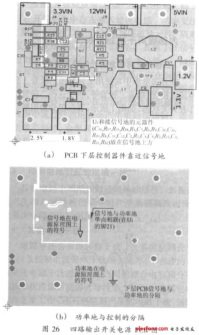 最后討論一種多路輸出開關(guān)電源PCB排版要點。此電源有3組輸入電壓(12V,5V和3.3V),4組輸出電壓(3.3v,2.6V,1.8V,1.2V)。該電源使用了,一集成多路開關(guān)控制器(Serotech型號SC2453)。SC2453提供了4.5V~30V的寬輸入電壓范圍,兩個高達(dá)700kHz開關(guān)頻率和高達(dá)15A輸出電流,以及低至0.5V輸出電壓的同步降壓轉(zhuǎn)換器。它還提供了一個專用可調(diào)配正壓線性調(diào)節(jié)器和一個專用可調(diào)配負(fù)壓線性調(diào)節(jié)器。TSSOP-28封裝減小了所需線路板面積。兩個異相降壓轉(zhuǎn)換器可以減小輸入電流紋波。圖25是這種多路開關(guān)電源的原理圖。其中3.3V輸出由5V輸人產(chǎn)生,l.2V輸出由12V輸入產(chǎn)生,2.6V和1.8V輸出由3.3V輸入產(chǎn)生。由于該電源上所有元器件都必須被放置在一個面積較小的PCB上,為此必須將電源的功率地層和控制信號地層分隔開來。參照前面幾節(jié)中討論過的要點,首先將圖25中連接到功率地層的元器件和連接到控制信號地層的元器件區(qū)分開來,然后將控制信號元器件放在信號地層上并靠近SC2453控制信號地層與功率地層通過單點相連接。這連接點通常會選擇在控制芯片的接地腳(SC2453中的腳21)。圖26詳細(xì)描述了該電源排版方式。