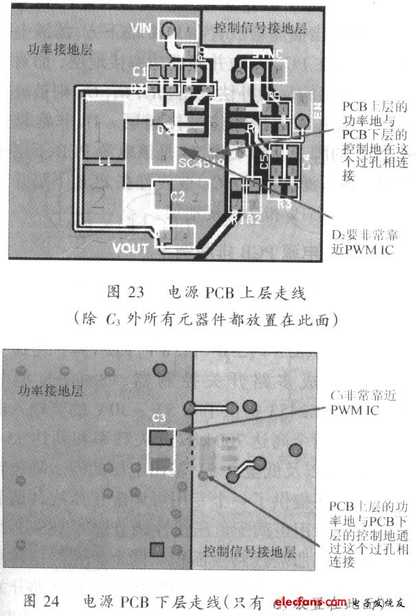 圖23是該電源PCB上層排版圖。為了力便讀者理解,功率接地層和控制信號接地層分別用不同顏色來表示。在這里輸入插座被放置在PCB的上方,而輸出插座被放置在PCB的下方.濾波電感(L1)被放在PCB左邊并靠近功率接地層,而對于噪音較敏感的反饋補償電路(R3,C4,C5)則被放存PCB右邊并靠近控制信號接地層。D2非常靠近SC4519的腳3及腳4。圖24是該電源PCB下層排版圖。輸入濾波電容(C3)被放置在PCB下層并非常靠近SC4519和功率接地層。