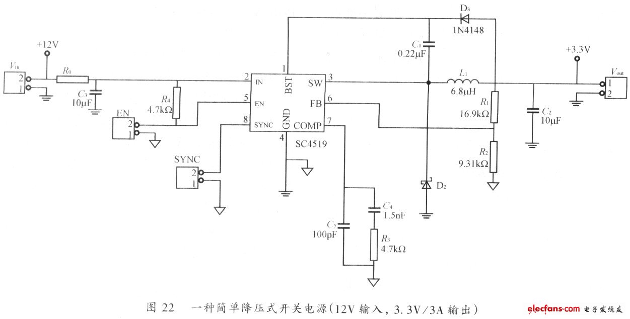 圖22是另一種降壓式開關(guān)電源,該電源能使12V輸入電壓轉(zhuǎn)換成3.3V輸出電壓,輸出電流可達(dá)3A。此電源上使用了一個集成電源控制器(Semtech型號SC4519)。這種控制器將一個功率管集成在電源控制器芯片中。這樣的電源非常簡單,尤其適合應(yīng)用在便攜式DVD機(jī),ADSL,機(jī)頂盒等消費類電子產(chǎn)品。